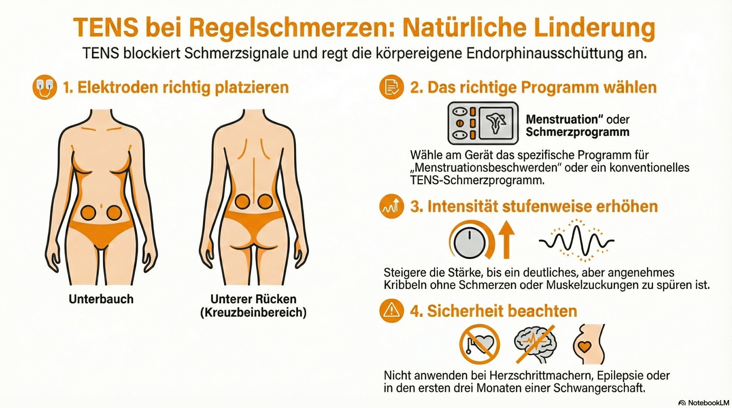 - Kombinieren: TENS und Wärme (z. B. Wärmflasche auf dem Bauch, TENS am Rücken) können sich ergänzen.